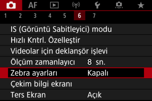 - [Zebra 2]: Belirtilen parlaklığı aşan alanlar üzerinde sağa eğimli şeritleri görüntüler.
