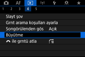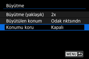 Büyütülmüş görünüm için aynı konumu korumak veya sonraki görüntüleri ekrandayken [Büyütülen konum] içinde ayarlanan konumu kullanmak üzere ayar yapabilirsiniz.