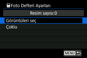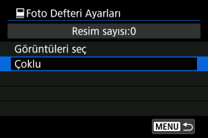 [Çoklu] seçeneği içinde [: Foto Defteri Ayarları] için [Klasördeki tüm görüntüler] veya [Karttaki tüm görüntüler] seçildiğinde klasör veya karttaki tüm görüntüler foto defteri için seçilir.