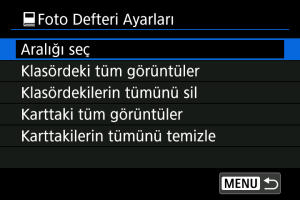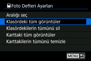Seçimi iptal etmek için [Klasördekilerin tümünü sil] veya [Karttakilerin tümünü temizle] seçimi yapın.