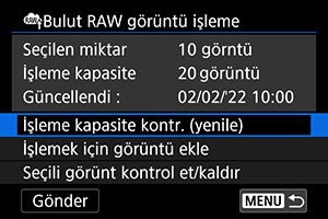 - Bulutta RAW görüntüleri işleme için ücretli aboneliğiniz yoksa [İşleme kapasite] [0] olur. Abonelik olmadan işleme kapasitesini kontrol ederseniz, image.canon'a kayıtlı e-posta adresinden abonelik bilgilerini alacaksınız.