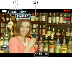 - Video çekim düğmesine bastığınız andan itibaren geçen süre, önizleme/akış ekranında (1) gösterilir. Akış için, izleyici sayısı da belirtilir (2).