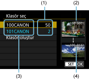 - Klasörler üç basamaklı klasör sayısını harfler veya rakamlar takip edecek şekilde “100CANON” örneğindeki gibi adlandırılır. Bir klasörde en fazla 9999 görüntü olabilir (dosya numarası 0001 - 9999). Bir klasör dolduğunda, otomatik olarak klasör numarası bir artırılmış yeni bir klasör oluşturulur. Ayrıca, manuel sıfırlama işlemi () uygulandığında, otomatik olarak yeni bir klasör oluşturulur. 100 ile 999 arasında numaralandırılmış klasörler oluşturulabilir.