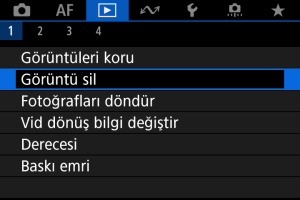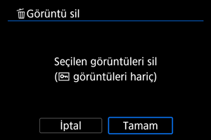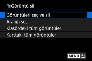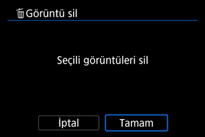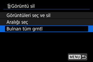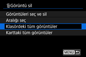 : Görüntü sil] içinde [Klasördeki tüm görüntüler] veya [Karttaki tüm görüntüler] seçimi yaparsanız, karttaki veya klasördeki tüm görüntüler silinir.