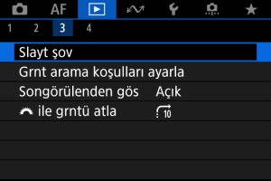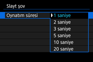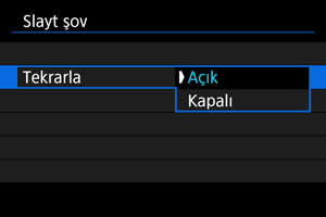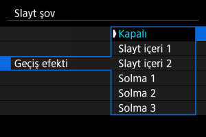 - Fotoğraflar için [Oynatım süresi], [Tekrarla] (tekrarlamalı oynatma) ve [Geçiş efekti] (görüntü değişiminde efekt) ayarı yapın.