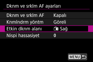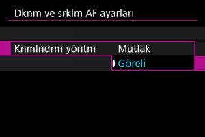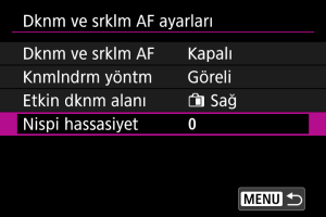 Daha hızlı AF noktası konumlandırması için pozitif uca doğru ayarlayın ve daha yavaş konumlandırma için negatif uca doğru ayarlayın.