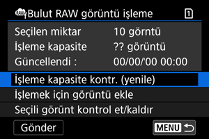 - Bulutta RAW görüntüleri işleme için ücretli aboneliğiniz yoksa [İşleme kapasite] [0] olur. Abonelik olmadan işleme kapasitesini kontrol ederseniz, image.canon'a kayıtlı e-posta adresinden abonelik bilgilerini alacaksınız.