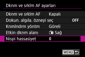 Daha hızlı AF noktası konumlandırması için pozitif uca doğru ayarlayın ve daha yavaş konumlandırma için negatif uca doğru ayarlayın.