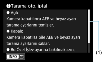 tuşuna basarak özellik hakkında bir açıklama görüntüleyebilirsiniz. Yardım ekranından çıkmak için tuşa tekrar basın. Sağda bir kaydırma çubuğu (1) görüntülendiğinde ekranda kaydırmak için