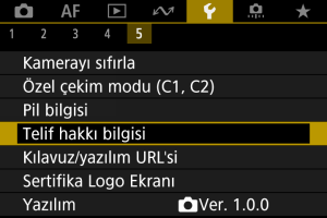 • EOS Utility ile de (EOS yazılımı, ) telif hakkı bilgilerini ayarlayabilir veya kontrol edilirsiniz.