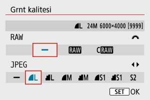 - Hem RAW hem de JPEG seçildiğinde, her çekimde aynı görüntü belirlediğiniz görüntü kalitesinde hem RAW hem de JPEG görüntü halinde eşzamanlı olarak karta kaydedilir. İki görüntü, aynı dosya numarasıyla kaydedilir (dosya uzantısı: .JPG; JPEG için ve .CR3; RAW için).