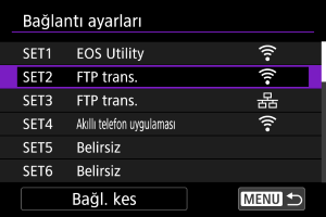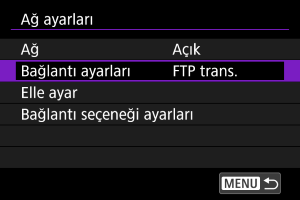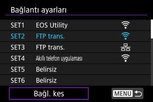 [Açık] olarak ayarlandığında ve belirli bir süre hiç görüntü aktarımı yapılmadığında, fotoğraf makinesi FTP sunucusundan çıkış yapar ve LAN bağlantısı kesilir. Fotoğraf makinesi görüntü aktarımına yeniden hazır hale geldiğinde bağlantı otomatik olarak yeniden kurulur. LAN bağlantısını kesmek istemiyorsanız [Kapalı] olarak ayarlayın.
