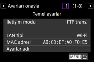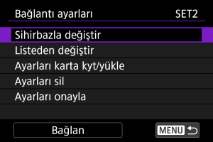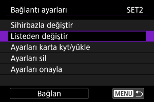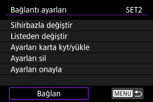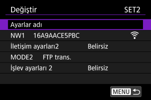 Fotoğraf makinesine kayıtlı olan iletişim ve işlev ayarlarını kullanarak makinede kayıtlı bağlantı ayarını değiştirin. Ayar isimlerini de kaydedebilirsiniz.