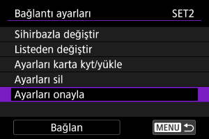 Bağlantı ayarları bir karta kaydedilebilir ve diğer fotoğraf makinelerine uygulanabilir. Diğer makinelerde yapılandırılan makine ayarları kullanılacak makineye de uygulanabilir.