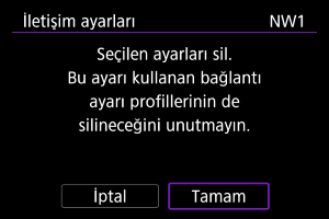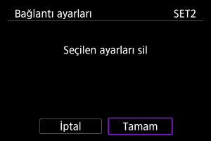 - [Seçileni temizle] seçildiğinde kayıtlı bağlantı ayarlarıyla iletişim ayarlarını siler. Onay ekranında [Tamam] seçimi yapın.
