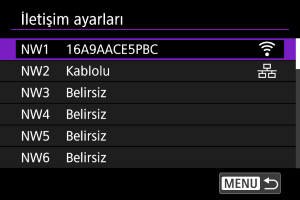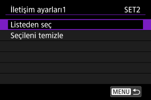 [Listeden seç] seçildiğinde, makinede kayıtlı olan iletişim ayarları listelenir. Kullanılacak iletişim ayarlarını seçin.