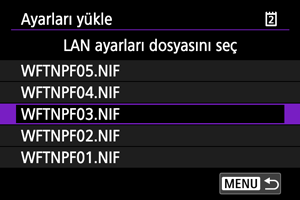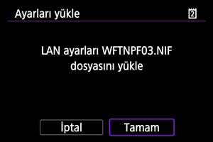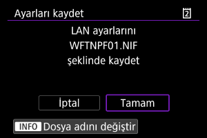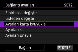 Bağlantı ayarlarını bir karta kaydedin veya kayıtlı bağlantı ayarlarını karttan fotoğraf makinesine yükleyin ().