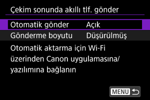 [Akıllı telefon ayarları] içinde [Çekim sonunda akl.tlf. gönder] seçilirse otomatik olarak gönderilecek görüntülerin boyutunu ayarlayabilirsiniz.