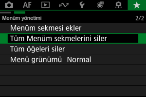 Oluşturduğunuz tüm Menüm sekmelerini silebilirsiniz. [Tüm Menüm sekmelerini siler] seçildiğinde, [MY MENU1] ile [MY MENU5] arasındaki tüm sekmeler silinir ve [] sekmesi varsayılan ayarına geri döner.