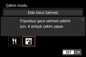 Tripod veya benzeri bir ekipman olmadan elde gece çekimi için.