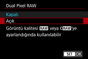 - Dual Pixel verisi içeren bir RAW görüntü (Dual Pixel RAW görüntü) kaydedilir.