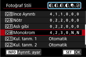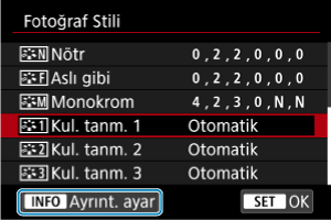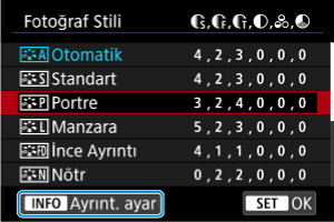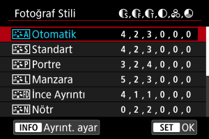 - Ayarlanacak Fotoğraf Stilini seçin, sonra INFO tuşuna basın.