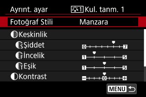 [Portre] veya [Manzara] gibi baz bir Fotoğraf Stili seçebilir, bunu istediğiniz gibi ayarlayabilir ve [Kul. tanm. 1] – [Kul. tanm. 3] altına kaydedebilirsiniz. Farklı ayarlarla çok sayıda Fotoğraf Stili yaratırken kullanışlıdır.