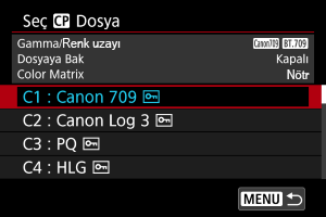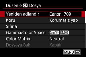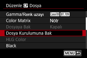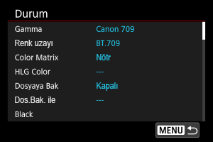 - Kayıttan sonra [Gamma/Color Space], [HLG Color] veya [Over 100%] ayarlarını değiştirirseniz kayıtlı bir görünüm dosyası kullanılamaz.