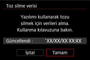 Toz lekelerini silmek için kullanılan Toz Silme Verisi görüntülere eklenebilir. Toz Silme Verisi, Digital Photo Professional (EOS yazılımı) tarafından toz partiküllerini otomatik olarak silmek için kullanılır.