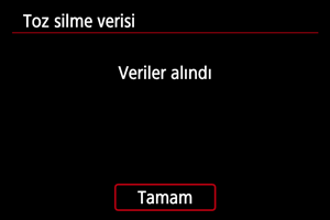- Resim çekildiği zaman fotoğraf makinesi Toz Silme Verisini toplamaya başlar. Toz Silme Verisi elde edildiğinde bir mesaj görüntülenir.