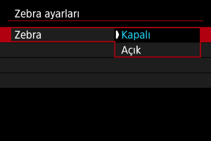 Video kaydı öncesinde veya sırasında pozu ayarlamanıza yardımcı olmak için, belirli bir parlaklığa sahip görüntü alanlarının üzerinde veya çevresinde şeritli bir desen görüntüleyebilirsiniz.