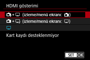 ] olduğunda karta kayıt yapılmaz. Fotoğraf makinesi menüleri ve görüntü oynatma sadece HDMI aracılığıyla bağlanmış ekranda görüntülenir.
