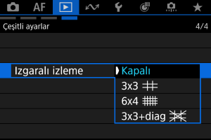 Fotoğraflar üzerinde oynatma ekranında tek tek görüntülenirken bir kılavuz görüntüleyebilirsiniz. Bu işlev, görüntülerdeki yatay/dikey eğikliği ve kompozisyonu kontrol etmek için kullanışlıdır.