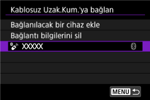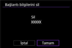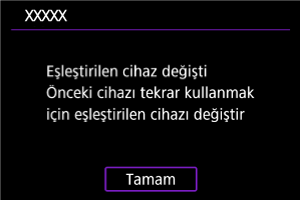 - Fotoğraf makinesi zaten başka bir cihazla eşleştirilmişse bir mesaj görüntülenir. Mevcut Bluetooth bağlantısını sonlandırmak için [Tamam]’ı seçin.