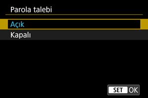 Güç düğmesi konumuna getirildiğinde veya makine otomatik kapanma modundan çıktıktan sonra girilen parolayı yönetmek için bu ayarları kullanın. Fotoğraf makinesinin başlatılması sırasında gerekli olan parolayı ayarlama talimatları için, Parola Ayarlama konusuna bakın.