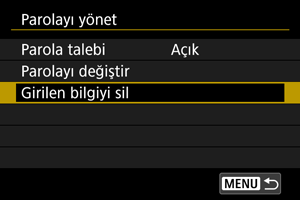 Fotoğraf makinesine girilen parolayı ve diğer bilgileri silebilirsiniz.