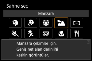 Uzaktaki ve yakındaki her şeyi odağa almak istediğinizde geniş manzaralara yönelik [] (Manzara) modunu kullanın. Canlı maviler ve yeşiller için ve net ve berrak görüntüler için.