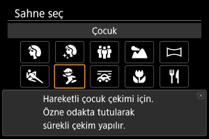 ] (Yüksek hızda sürekli çekim). Karar verdiğiniz anda deklanşöre tam basarak resmi çekin. Konuyu takip etmek ve yüz ifadesi ve hareketteki değişimleri yakalamak için deklanşör tuşuna yarım basmayı sürdürerek sürekli çekim yapın.