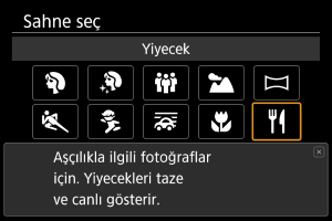 Mutfak fotoğraflarında [] (Yiyecek) modunu kullanın. Fotoğraf parlak ve lezzetli görünür. Ayrıca tungsten ışıklardan veya benzer ışık kaynaklarından kaynaklanan kırmızımsı renkleri de azaltır.