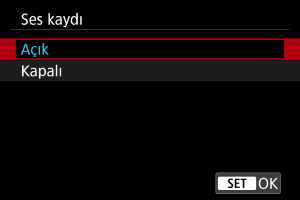 Video kaydı sırasında ses kaydı için [Açık] seçimi yapın. Harici veya çok işlevli aksesuar kızağı için tasarlanmış mikrofonlar kullanmadığınız sürece kayıt için dahili mikrofonu kullanılır.