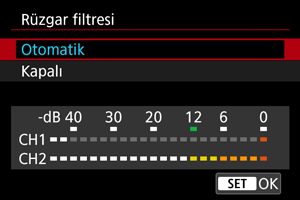 Rüzgarlı açık alan sahnelerinde ses bozulmasını azaltmak için [Otomatik] (veya [Açık]) olarak ayarlayın. Rüzgar filtresi etkinleştiği zaman, düşük bas ses de bir miktar azalır.