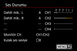 : Ses izleme] içindeki [Kulaklıklar] için [Çekim monitörü CH] ile ayarlanmış kanalları belirtir.