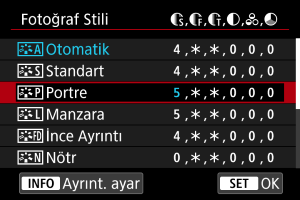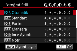 [Portre] veya [Manzara] gibi önayarlara ya da bir Fotoğraf Stili dosyasına göre yeni bir stil ekleyebilir, sonra gereken ayarları yapabilirsiniz (). Henüz özelleştirmediğiniz bir stille yapılan çekimler, varsayılan [Otomatik] ayarıyla aynı özelliklere sahip olacaktır.