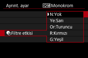 | N:Yok | Filtre efekti olmayan, normal siyah/beyaz görüntü. |