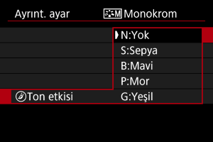 Herhangi bir Fotoğraf Stilini varsayılan ayarlarını değiştirerek özelleştirebilirsiniz. [Siyah beyaz] özelleştirmesi ile ilgili daha fazla bilgi almak için Monokrom Ayarı konusuna bakın.