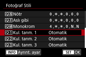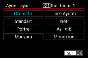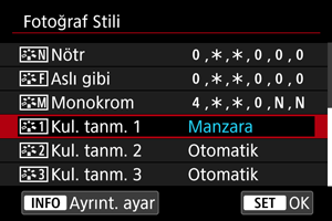 [Portre] veya [Manzara] gibi baz bir Fotoğraf Stili seçebilir, bunu istediğiniz gibi ayarlayabilir ve [Kul. tanm. 1] – [Kul. tanm. 3] altına kaydedebilirsiniz. Farklı ayarlarla çok sayıda Fotoğraf Stili yaratırken kullanışlıdır.