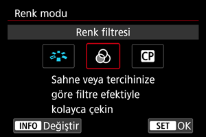 Tercih ettiğiniz video veya fotoğraf görüntüsü özelliklerini Fotoğraf Stili, Renk Filtresi veya Özel Fotoğraf menüsünden ayarlayabilirsiniz.