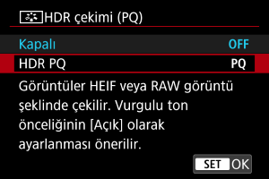 [HDR çekim (PQ)] özelliği, parlak ve gölgeli alanlardaki ayrıntıları koruyan ve ITU-R BT.2100 ve SMPTE ST.2084'te tanımlanan PQ spesifikasyonuna (HDR görüntü gösterimi için giriş sinyali gama eğrisine atıfta bulunur) uygun yüksek dinamik aralıklı görüntüler yakalamanızı sağlar.