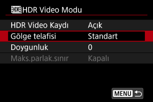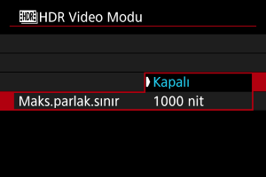 - [Kapalı] ile maksimum parlaklık sınırlanmaz. 1000 nit'i aşan parlaklıklarda ekranı destekleyen bir monitörde görüntüleri inceleyeceğiniz zaman kullanmanız önerilir.