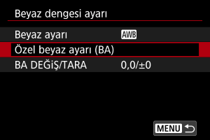 Özel beyaz ayarıyla çekim mekanındaki belirli ışık kaynağı için manuel beyaz ayarı yapabilirsiniz. Bu prosedürü çekimin yapılacağı yerin ışık kaynağı altında yaptığınızdan emin olun.